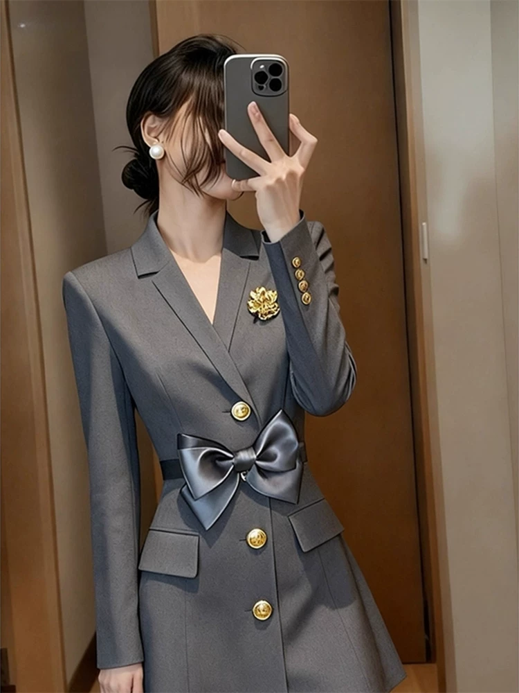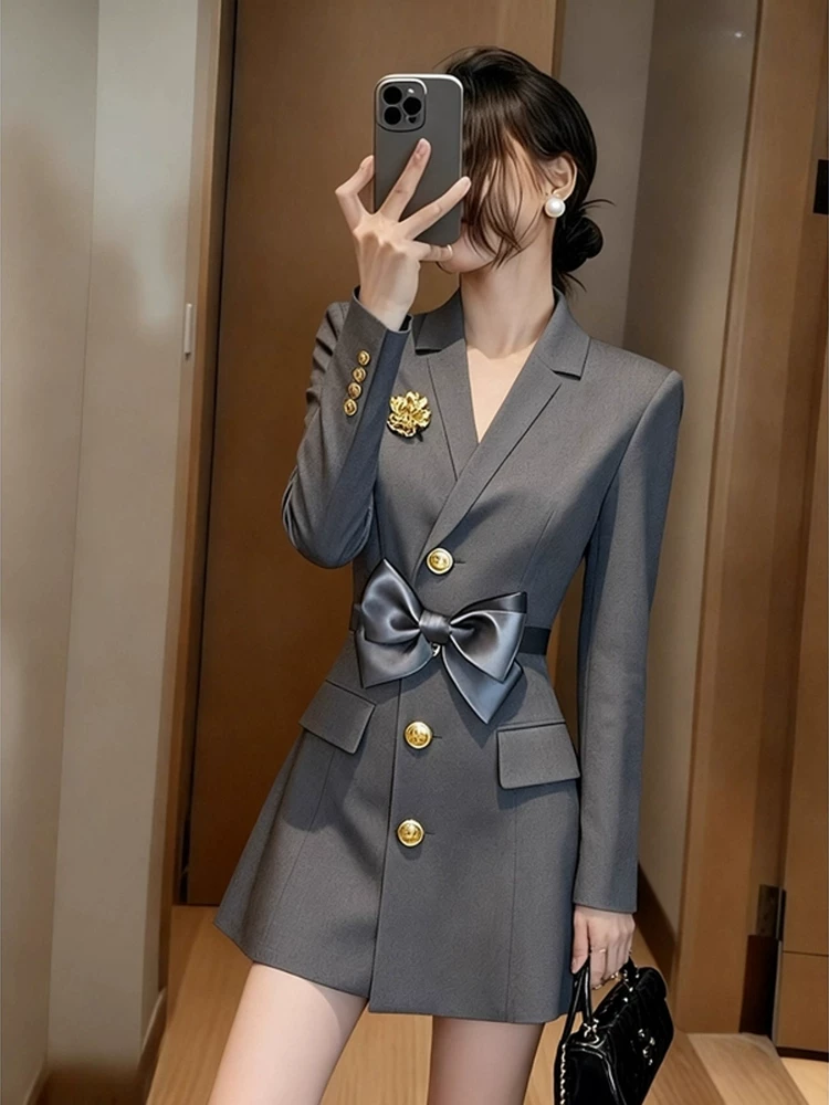 2026 light luxury, high-end professional temperament, small fragrant style top, huge and beautiful skirt, pinch waist gray suit dress