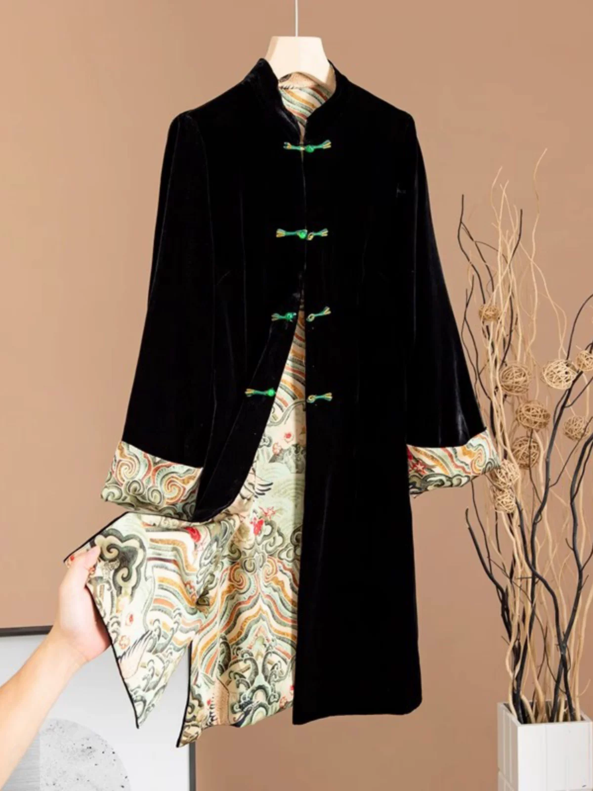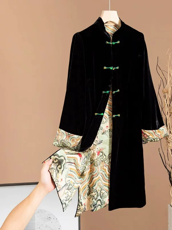 First-line brand discount clearance clearance Chinese style mid-length silk velvet windbreaker plate buckle retro cheongsam women’s jacket